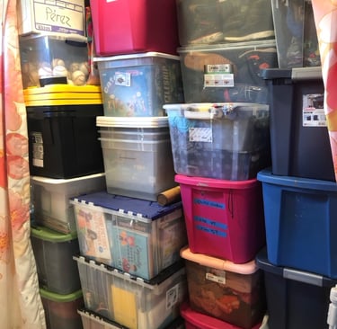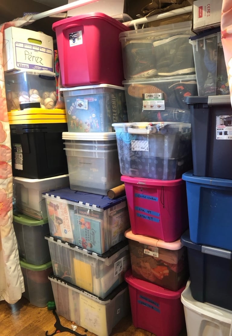 Above: Totes of books, clothes & winter gear